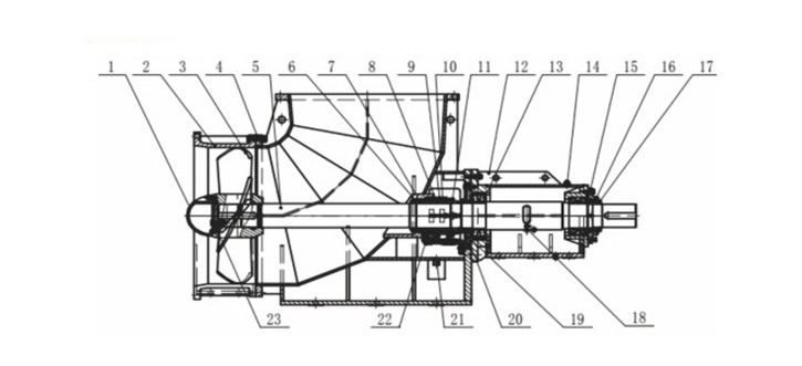 1-導流(liú)罩 2-入口短節(jie) 3-葉輪 4-泵體 5-軸(zhóu) 6-襯套 7-軸套 8-水(shui)封環 9-水封環(huán)填料壓蓋 -10填(tián)料壓 12-軸面座(zuò) 13-軸承 14-氣孔蓋(gai) 15-軸承擋套 16-後(hou)軸承壓蓋 17-後(hòu)擋醋盤 -18油垃(la)部位 -19前軸毋(wú)壓蓋 -20前擋酸(suān)盤 -21洩液管 22-管(guǎn)接頭 23-軸唱墊(nian)采用懸臂式(shì)結構,結構簡(jiǎn)單,維修方便(biàn),不用拆卸泵(bèng)體和管線✏️,葉(ye)輪反裝即可(ke)改變介質流(liú)向。